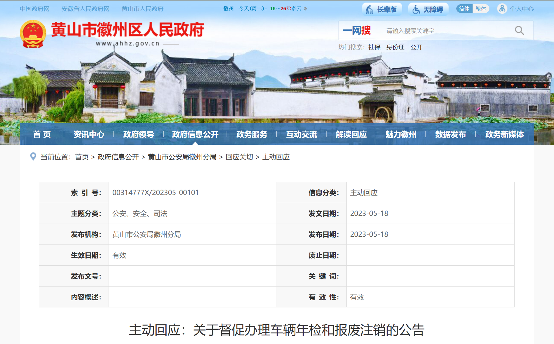 安徽省黃山市公安局徽州分局關(guān)于督促辦理7至9座小型客車年檢和報廢注銷的公告