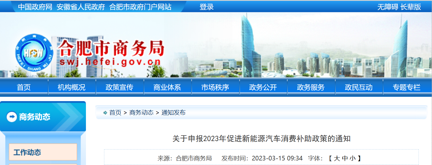 安徽省合肥市商務(wù)局關(guān)于申報(bào)2023年促進(jìn)新能源汽車(chē)消費(fèi)補(bǔ)助政策的通知為貫徹落實(shí)2023年《合肥市人民政府辦公室關(guān)于印發(fā)合肥市“提信心拼經(jīng)濟(jì)”若干政策措施的通知》...