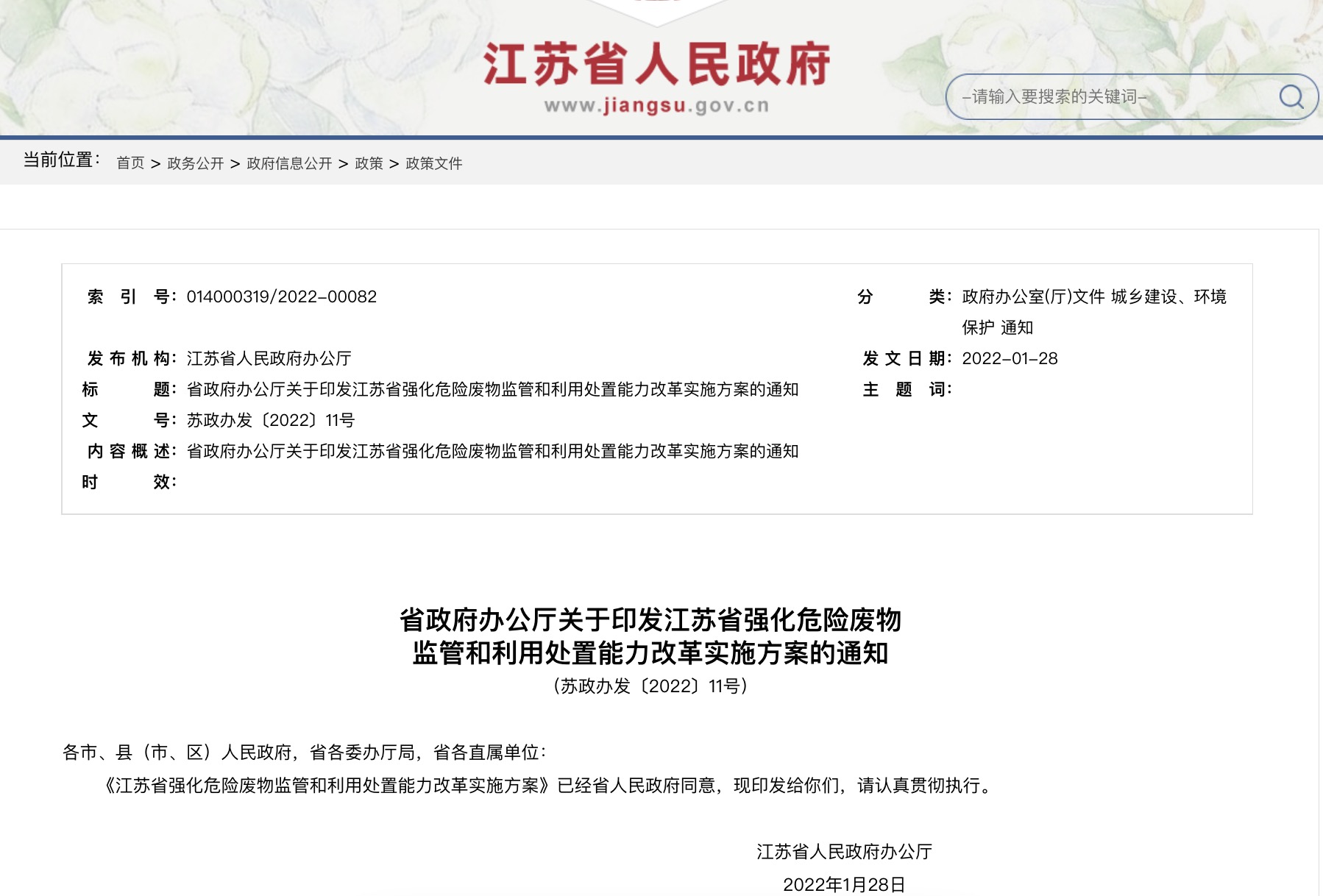 省政府辦公廳關(guān)于印發(fā)江蘇省強(qiáng)化危險(xiǎn)廢物監(jiān)管和利用處置能力改革實(shí)施方案的通知(蘇政辦發(fā)〔2022〕11號(hào))各市、縣(市、區(qū))人民政府,省各委辦廳局,省各直屬單位:...