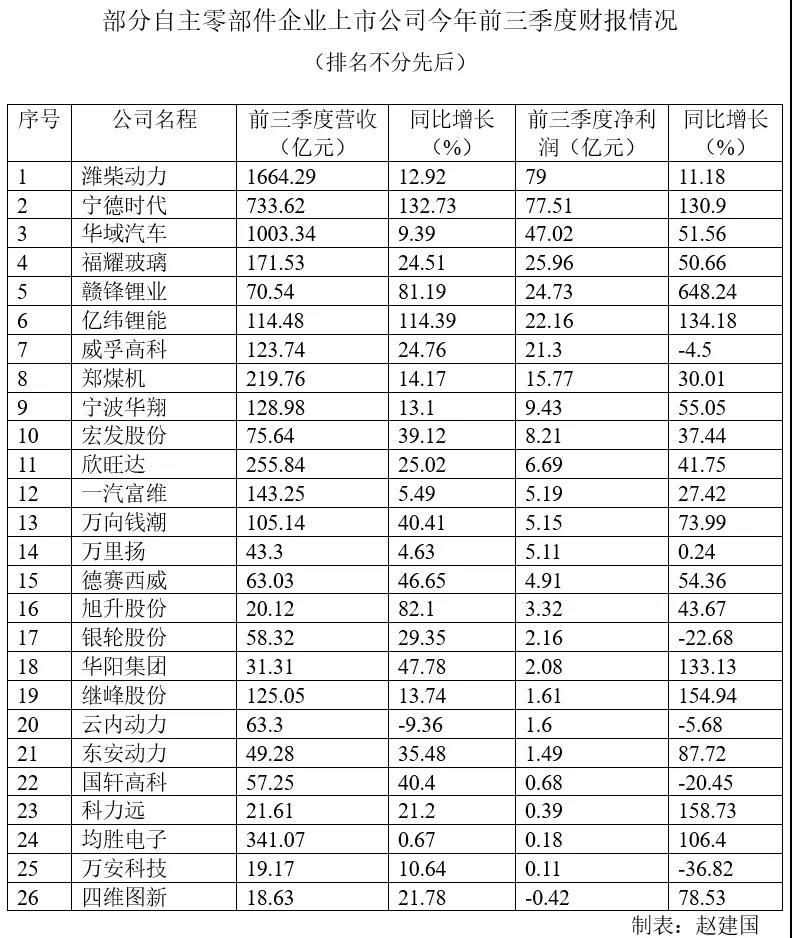 濰柴動力、寧德時代、華域汽車等自主零部件企業(yè),今年前三季度凈利潤均超過40億元,成為行業(yè)中的大贏家。近日,自主零部件行業(yè)上市公司陸續(xù)發(fā)布的前三季度財報,亮出了企...