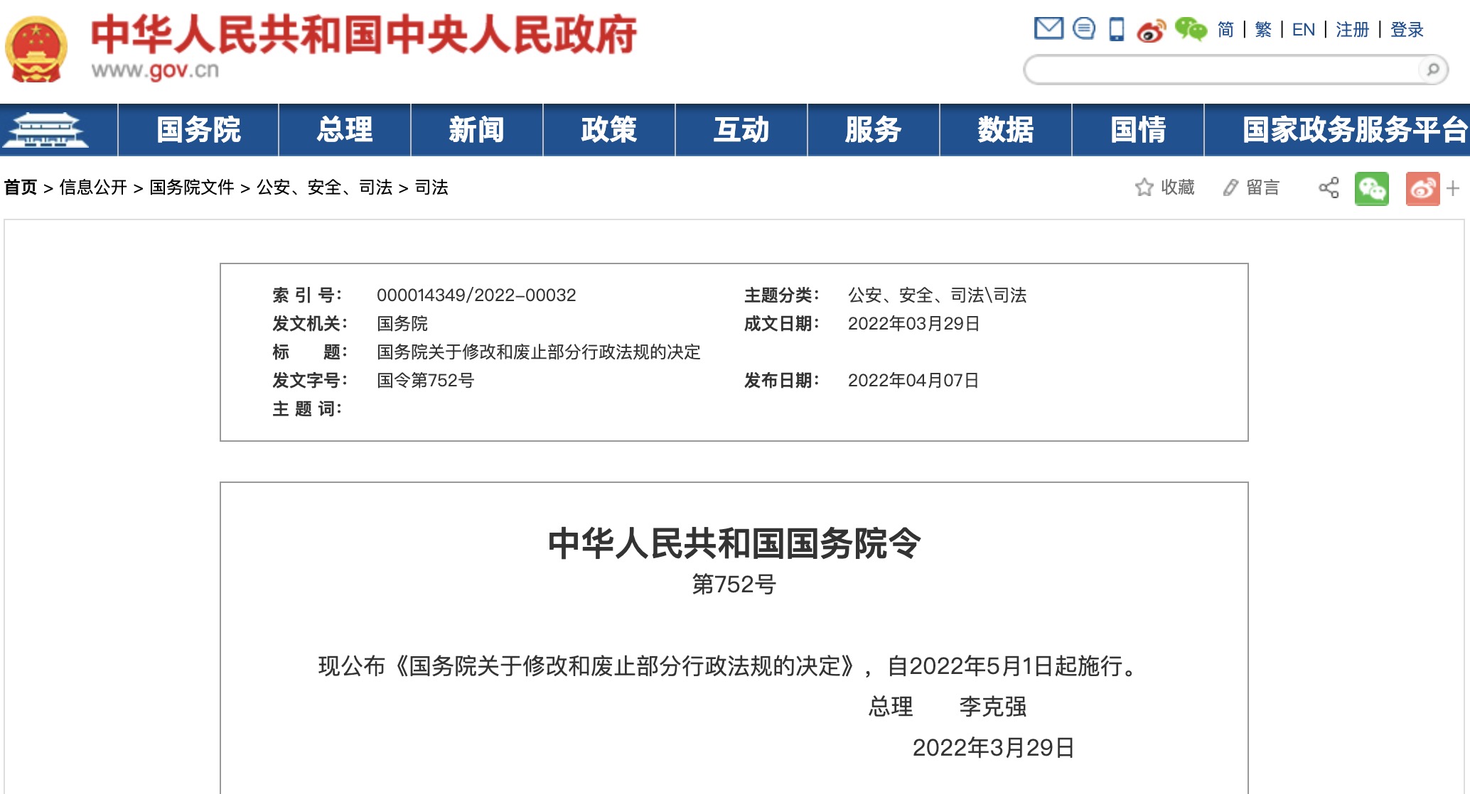 索引號:000014349/2022-00032主題分類:公安、安全、司法\司法發(fā)文機關:國務院成文日期:2022年03月29日標題:國務院關于修改和廢止部分行...