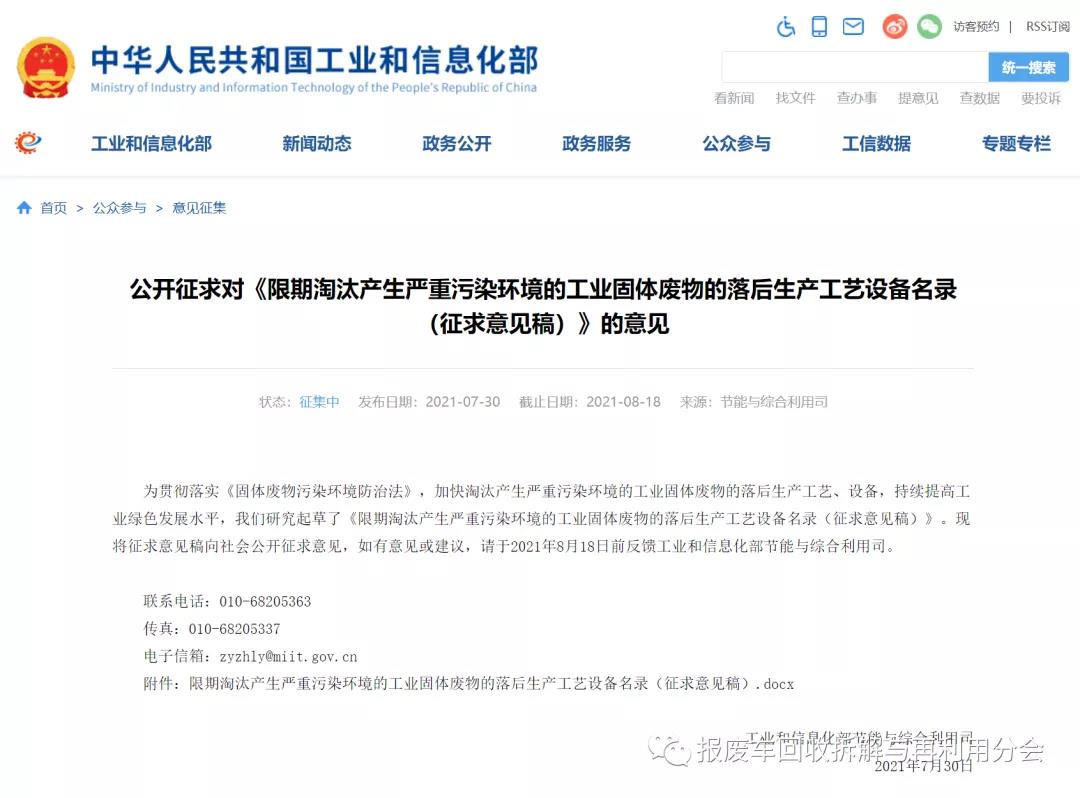 為貫徹落實《固體廢物污染環(huán)境防治法》,加快淘汰產(chǎn)生嚴(yán)重污染環(huán)境的工業(yè)固體廢物的落后生產(chǎn)工藝、設(shè)備,持續(xù)提高工業(yè)綠色發(fā)展水平,我們研究起草了《限期淘汰產(chǎn)生嚴(yán)重污染環(huán)境的工業(yè)固體廢物的落后生產(chǎn)工藝設(shè)備名錄(征求意見稿)》?,F(xiàn)將征求意見稿向社會公開征求意見,如有意見或建議,請于2021年8月18日前反饋工業(yè)和信息化部節(jié)能與綜合利用司。