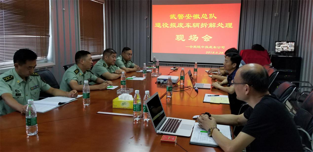 6月28日上午,武警安徽省總隊在合肥市皖中報廢汽車回收有限責(zé)任公司就皖中公司中標(biāo)的80余輛退役報廢車輛舉行拆解處理現(xiàn)場會。武警安徽總隊裝備保障處扶德才處長、吳峰副處長等6人;玉成有限公司副總裁兼皖中公司總經(jīng)理何學(xué)海、玉成有限公司大客戶(回收)總監(jiān)王東峰、皖中公司副總經(jīng)理胡冬祥、吳畏等參加。