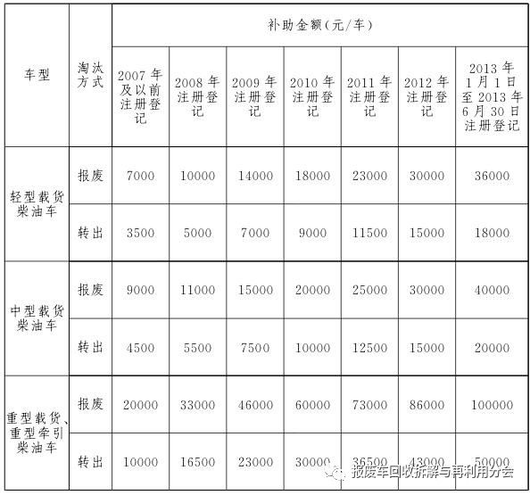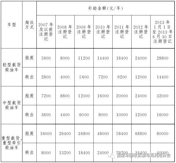 2017年9月21日至2019年9月20日期間,報(bào)廢或轉(zhuǎn)出高排放老舊柴油貨運(yùn)車可享受政府補(bǔ)助。其中,報(bào)廢車輛需在報(bào)廢期限前1年及以上進(jìn)行報(bào)廢方可享受政府補(bǔ)助。報(bào)廢或轉(zhuǎn)出時(shí)間以公安交通管理部門提供的車輛檔案注銷或轉(zhuǎn)出時(shí)間為準(zhǔn)。